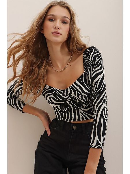 – dekolt: serce- krój: cropped- wzór: zebra