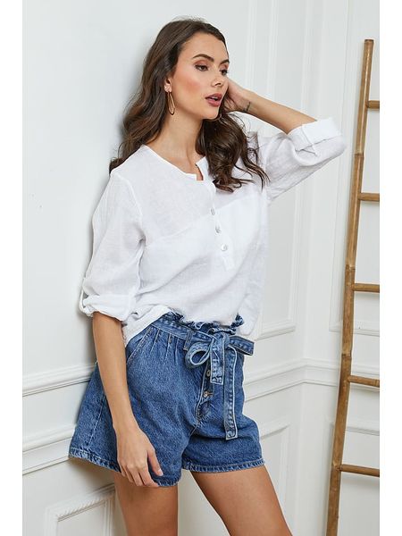 – czysty len- dekolt: z rozcięciem- zapięcie: skrócona listwa guzikowa- zakończenie rękawów: patka i guzik- krój: prosty- look: jednokolorowy