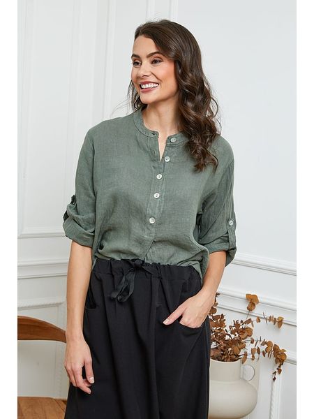 – czysty len- dekolt: okrągły- zapięcie: skrócona listwa guzikowa- zakończenie rękawów: patka i guzik- krój: prosty- look: jednokolorowy