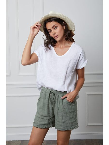 – czysty len- dekolt: V- zakończenie rękawa: podwijane- krój: prosty- look: jednokolorowy