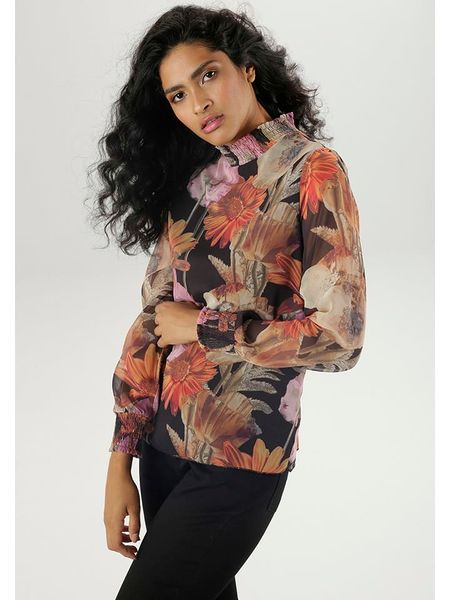 – kołnierz: stójka- zapięcie: guzik na plecach- zakończenie rękawów: mankiet na guzik- krój: prosty- wzór: kwiatowy