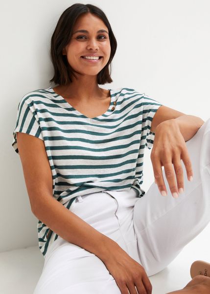 Bluzka lniana w paski z dekoltem w serek z przodu i z tyłu. Len to wytrzymałe włókno naturalne, które dzięki swoim właściwościom daje poczucie chłodu na skórze. Jego cechy charakterystyczne to drobne zagniecenia i teksturowana powierzchnia. Len jest przewiewny i przyjemny w noszeniu, co czyni go idealnym towarzyszem na lato.
