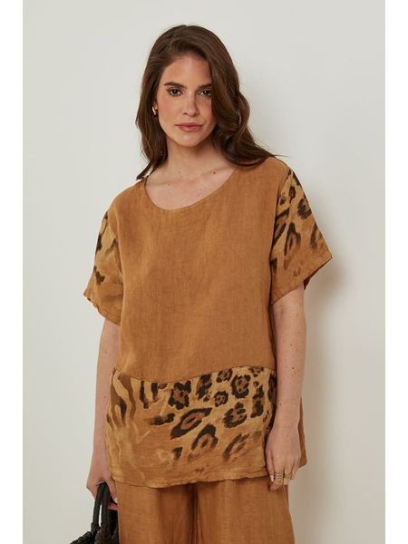 – czysty len- dekolt: okrągły- długość rękawa: półdługi- krój: oversized- wzór: panterka