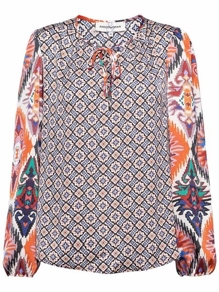 – dekolt: z rozcięciem- rękaw: bufiasty- zakończenie rękawów: elastyczne- detale: ozdobne wiązanie- krój: prosty- wzór: mix