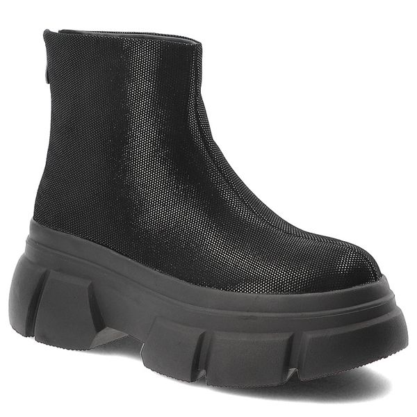 Botki damskie S. Barski, na wysokiej masywnej platformie z brokatową cholewką ze skóry, czarne, MR52-204