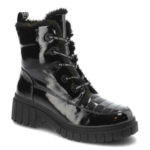 Botki damskie Artiker, cholewka z lakierowanej skóry z ociepleniem i wysoką cholewką oraz dekoracyjnymi taśmami masywna podeszwa z wyraźnym profilem,