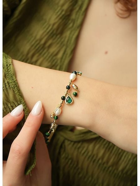 – materiał: mosiądz- powłoka: złoto- zapięcie: ściągane- rodzaj perły: hodowlana- kolor pereł: biały- rodzaj kamienia: cyrkonia- kolor kamienia: zielony- regulacja długości: takWskazówka: Zdjęcie produktu w powiększeniu.