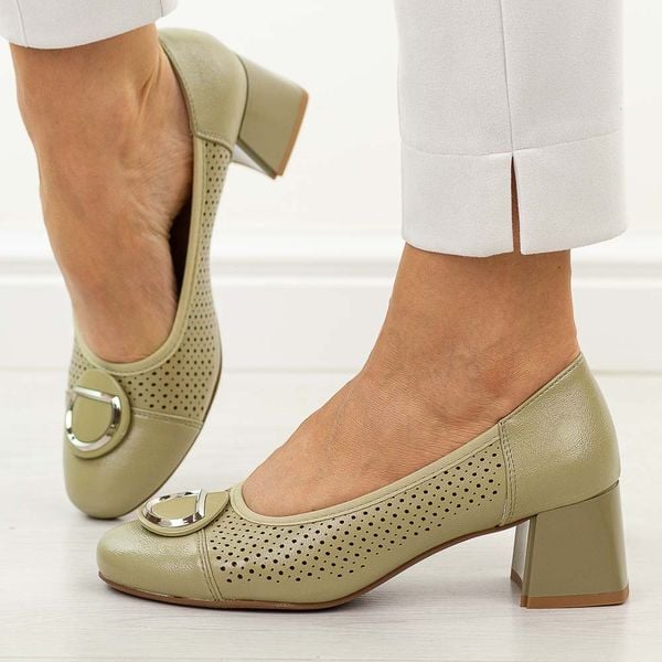 Oliwkowe ażurowe czółenka damskie na obcasie M.Daszyński Sa281-5