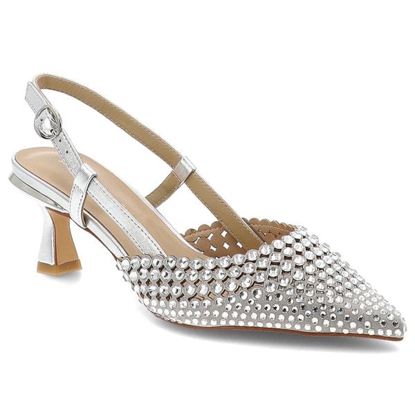Czółenka damskie Alma En Pena, skóra naturalna ażurowa cholewka ozdobne kryształki pasek z regulacją smukły nosek elegancki obcas, srebrne, V261855
