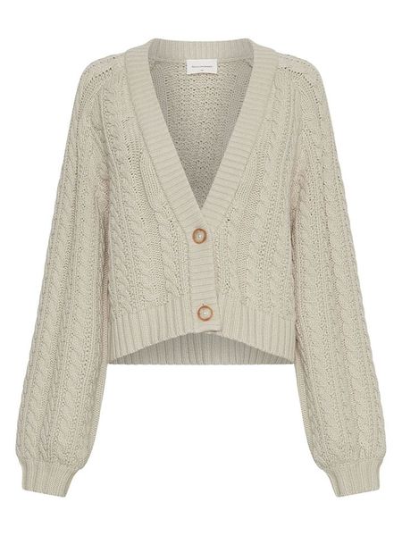 – dekolt: V- zapięcie: listwa guzikowa- krój rękawów: bufiasty- ściągacz: dekolt, zakończenia rękawów, dolny brzeg- wzór splotu: warkocz- krój: prosty- look: jednokolorowy