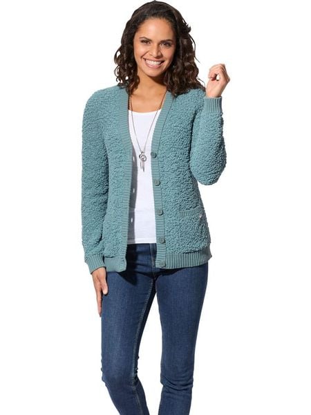 – dekolt: V- zapięcie: listwa guzikowa- ściągacz: dekolt, zakończenia rękawów, dolny brzeg- kieszenie: naszyte- krój: prosty- look: jednokolorowy- powierzchnia: pluszowa