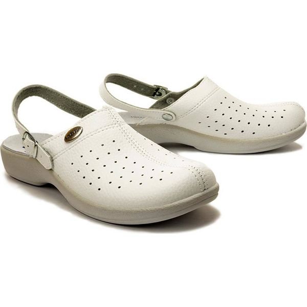 Klapki damskie. Perforowana cholewka. Skórzana wkładka. Ruchomy pasek. Klapki można uzytkować jako sandały. Elastyczna podeszwa.