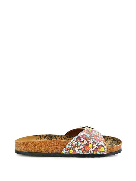 – materiał wierzchni ze skóry syntetycznej- zapięcie: sprzączka- noski: otwarte- powierzchnia: wzorzysta- wkładka: ergonomicznie formowana- podeszwa: antypoślizgowa