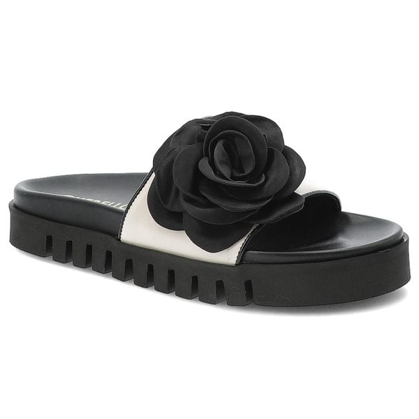 Klapki damskie Chebello, skórzane na platformie z ozdobnym kwiatem, beżowe, 4739-513