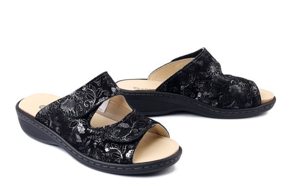 Klapki damskie. Naturalna skóra. Wymienna wkładka typu fusbet. Zapięcie na dwa rzepy. Lekka, elastyczna podeszwa PU. Tęgość G.