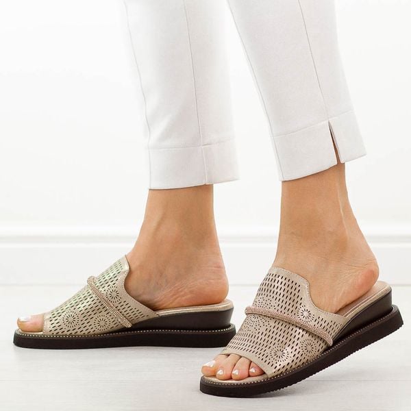 Złote skórzane klapki damskie na koturnie M.Daszyński 2267-14