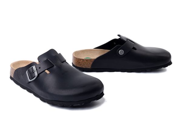 Klapki damskie. Naturalna skóra. Wkładka typu fusbet. Zapięcie na klamerkę. Lekka, wygodna podeszwa. Podwyższona tęgość.