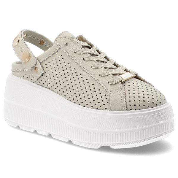 Klapki damskie S.Barski, ze skóry naturalnej licowej ażurowa cholewka platforma sznurowane styl casual, beżowe, LR61-7088