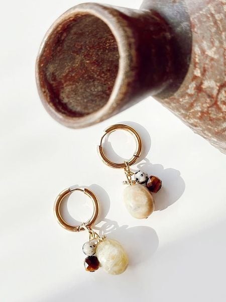 – materiał: stal szlachetna- powłoka: w kolorze złota- zapięcie: wtyk- rodzaj kamienia: labradoryt- kolor kamienia: szary, kremowy- rodzaj kamienia: hematyt- kolor kamienia: brązowyWskazówka: Zdjęcie produktu w powiększeniu.