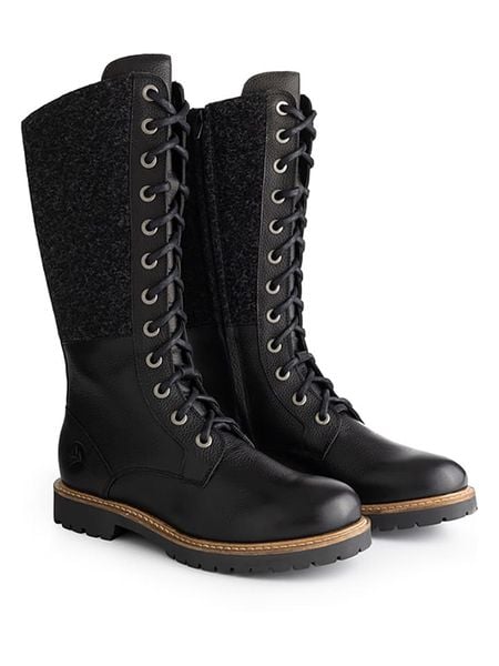 – zapięcie: sznurowanie z bocznym suwakiem- noski: zaokrąglone- noski i zapiętki: wzmocnione- wyściółka: ogrzewająca wełna- wkładka: wyjmowana- forma obcasa: blokowy- podeszwa: antypoślizgowa