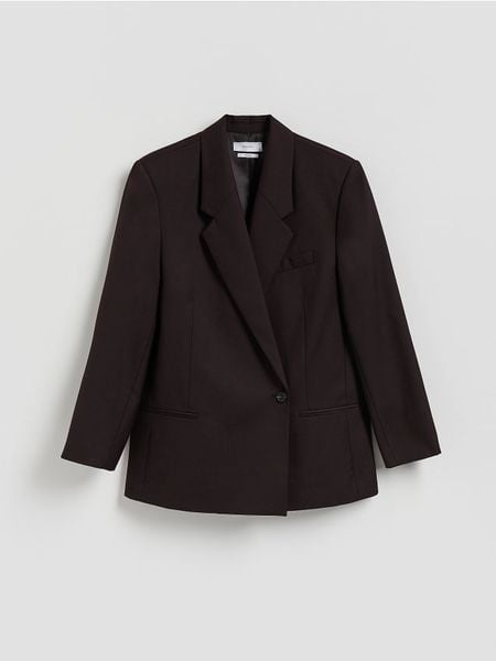 Marynarka o prostym kroju, wykonana z tkaniny z wełną.
