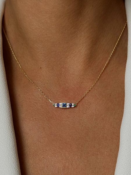 – materiał: srebro Sterling próby 925- powłoka: 18K złoto- typ łańcuszka: ankier- zapięcie: karabińczyk- rodzaj kamienia: cyrkonia- kolor kamienia: transparentny, zielony, błekitny i niebieski- regulacja długości: takWskazówka: Zdjęcie produktu w powiększeniu.
