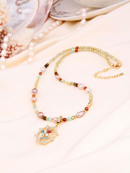 – materiał: mosiądz- powłoka: złoto- zapięcie: karabińczyk- rodzaj perły: hodowlana – słodkowodna- kolor pereł: jasnoróżowy, fioletowy- rodzaj kamienia: cyrkonia- kolor kamienia: bezbarwny- rodzaj kamienia: kryształ- kolor kamienia: wielokolorowy- regulacja długości: takWskazówka: Zdjęcie produktu w powiększeniu.