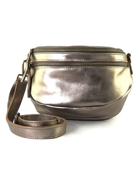 – materiał: skóra- powierzchnia: z metalicznym połyskiem- długi pasek przez ramię: regulowany, odpinany- zapięcie: suwak- tekstylna podszewka: tak