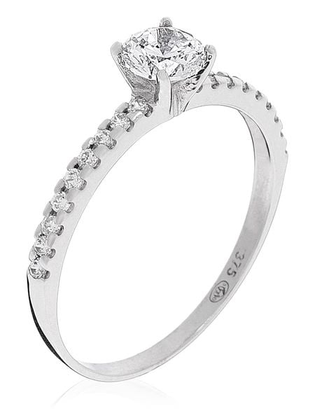 – materiał: 9-karatowe białe złoto próby 375- rodzaj kamienia: cyrkonia- kolor kamienia: bezbarwnyWskazówka: Zdjęcie produktu w powiększeniu.