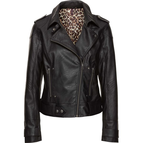 Luźniejsza kurtka z imitacji skóry z podszewką w panterkę. Ze sztucznej skóry, z naszywanymi szlufkami, ćwiekami i napami. Zapinana na wszyty ukośnie zamek. Z przodu kieszenie. Podszewka w modny deseń w cętki leoparda. Całkowita dł. w rozm. 38 ok. 54 cm.