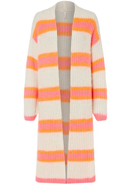 Modny i bardzo kobiecy płaszcz dzianinowy oversized z puszystej przędzy, we wzór w paski. Dł. w rozm. 40/42 ok. 114 cm. Można prać w pralce.