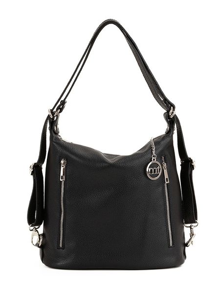 – materiał: skóra bydlęca- krótki pasek na ramię: regulowany- zapięcie: suwak- kieszenie zewnętrzne: tak, na zamek- kieszenie wewnętrzne: 1 kieszeń na zamek, 1 kieszeń otwarta- detale: zawieszka- tekstylna podszewka: tak- można nosić jako plecak
