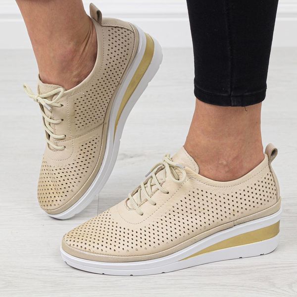Beżowe skórzane ażurowe półbuty damskie na koturnie T.Sokolski 150