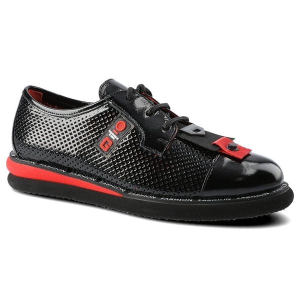 Półbuty damskie Lanqier, wykonane z materiału o gładkiej powierzchni z perforacjami z klasycznym sznurowaniem gumowym noskiem, czarne, 46C2340