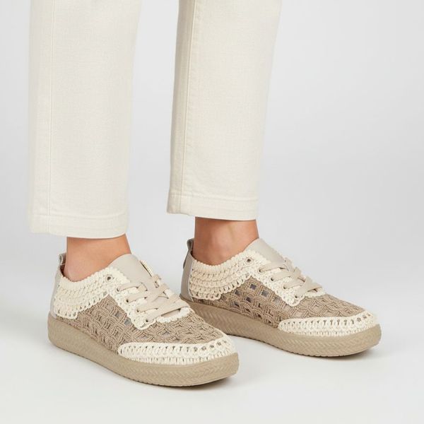 Półbuty damskie S.Barski, cholewka połączenie materiału tekstylnego i koronki wiązanie klasyczne perforowane panele niski fason zaokrąglony nosek, be