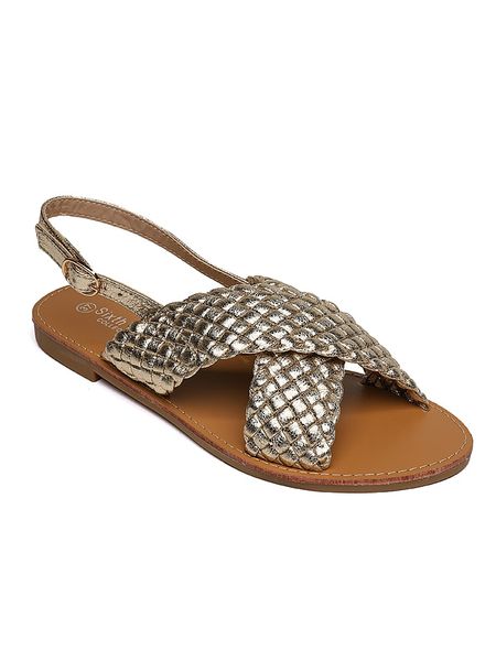 – zapięcie: sprzączka- noski: otwarte- powierzchnia: z metalicznym połyskiem – detale: plecionka- podeszwa: antypoślizgowa