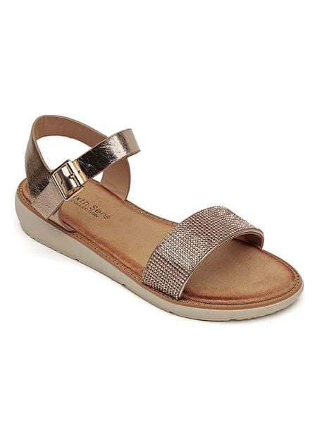 – zapięcie: sprzączka- noski: otwarte- powierzchnia: z metalicznym połyskiem – detale: błyszczące kamyczki- podeszwa: antypoślizgowa