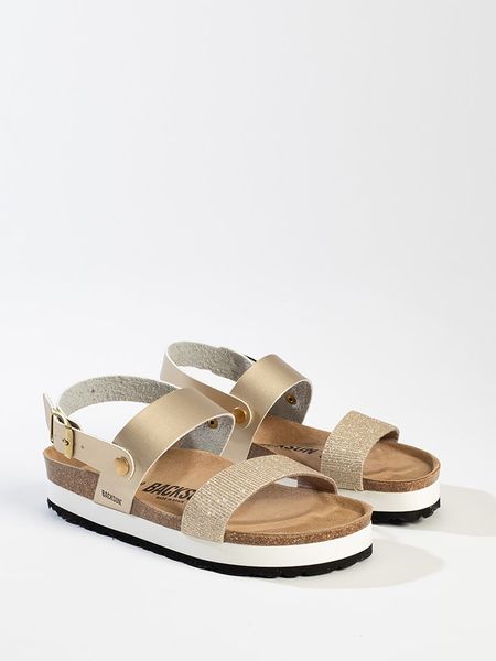 – rodzaj zapięcia: sprzączka- noski: otwarte- skórzana wkładka: ergonomicznie formowana- powierzchnia: z metalicznym połyskiem- forma obcasa: platforma- podeszwa: profilowana- wykonano w Hiszpanii