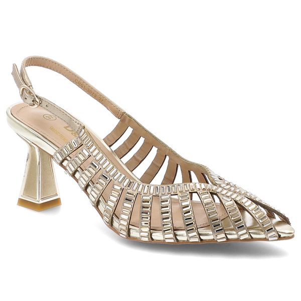 Sandały damskie S.Barski, cholewka ze skóry naturalnej z odkrytą piętą na efektownym obcasie z ażurową konstrukcją i geometrycznymi zdobieniami, złote, CR61-3073