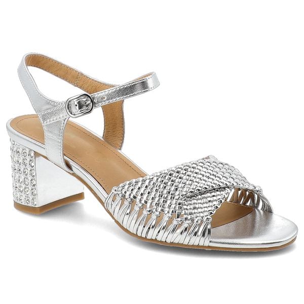 Sandały damskie S.Barski, cholewka ze skóry naturalnej na stabilnym obcasie z plecioną cholewką i biżuteryjnym zdobieniem, srebrne, CR61-3092