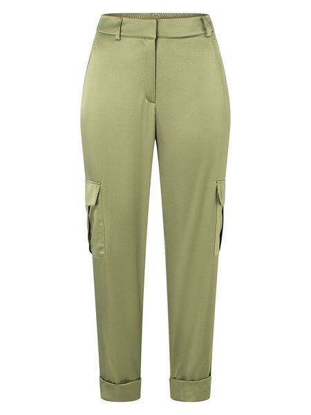 – z dodatkiem poliestru pochodzącego z recyklingu- wysokość pasa: high waist- szlufki na pasek: tak- zapięcie: haczyk i suwak- kieszenie: wpuszczane, cargo- zakończenia nogawek: trwale wywinięte- krój: wąski- look: jednokolorowy