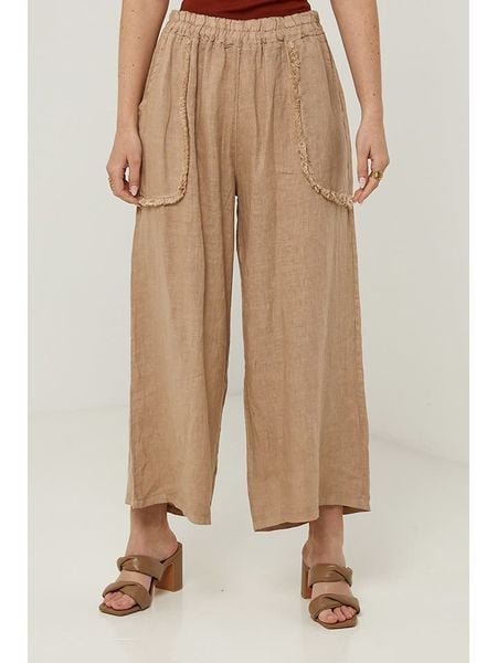 – czysty len- wysokość pasa: high waist- kieszenie: wpuszczane- długość nogawek: 7/8- krój: luźny- look: jednokolorowy