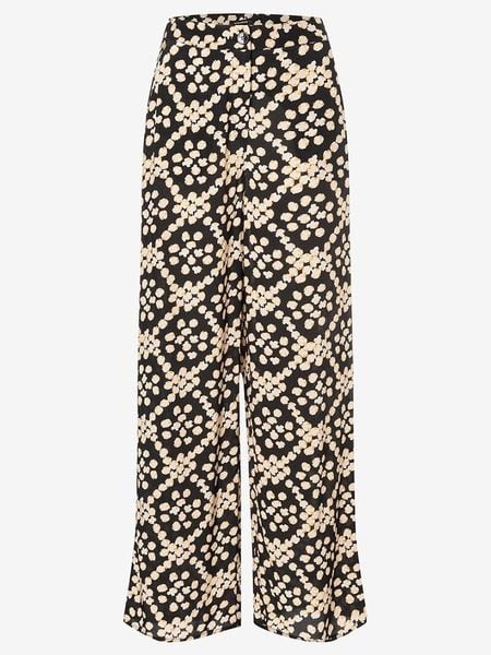 – wysokość pasa: high waist- zapięcie: guzik i suwak- kieszenie: wpuszczane- zakończenia nogawek: dzwony- krój: prosty- wzór: na całości
