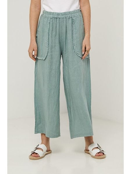 – czysty len- wysokość pasa: high waist- kieszenie: wpuszczane- długość nogawek: 7/8- krój: luźny- look: jednokolorowy