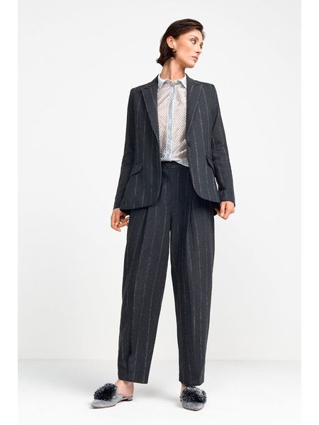 – wysokość pasa: high waist- szlufki na pasek: tak- zapięcie: guzik i suwak- kieszenie: wpuszczane i tylne- detale: kant- krój: luźny- wzór: paski