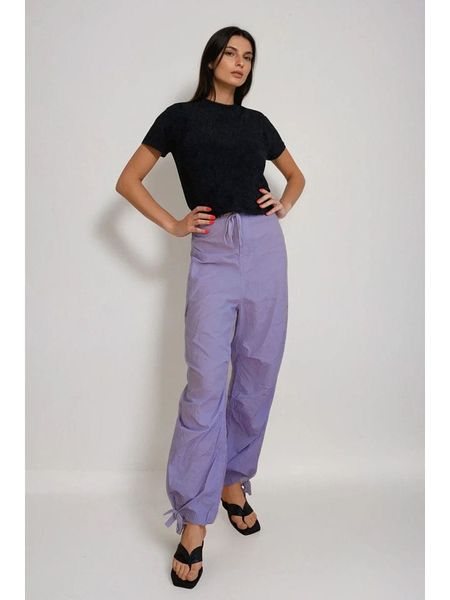 – wysokość pasa: high waist- pas: ściągacz tunelowy- zakończenie nogawek: wiązane tasiemki- fason: bombka- look: jednokolorowy