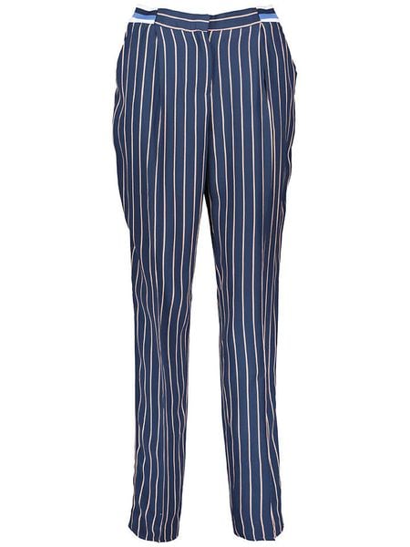 – czysta wiskoza- wysokość pasa: high waist- fason: regular fit- krój nogawek: prosty- zapięcie: haczyk i suwak- kieszenie: wpuszczane- wzór: paski