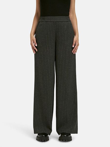 – wysokość pasa: high waist- pas / ściągacz: elastyczny- kieszenie: wpuszczane- detale: kant- krój: luźny- wzór: paski