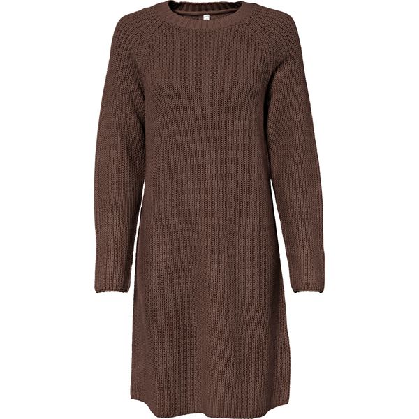 Modna sukienka dzianinowa w długości do kolan, z okrągłym dekoltem.