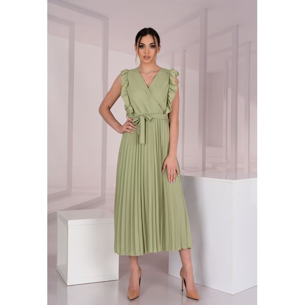 Elegancka Plisowana Sukienka z Kopertowym Dekoltem – Oliwkowa